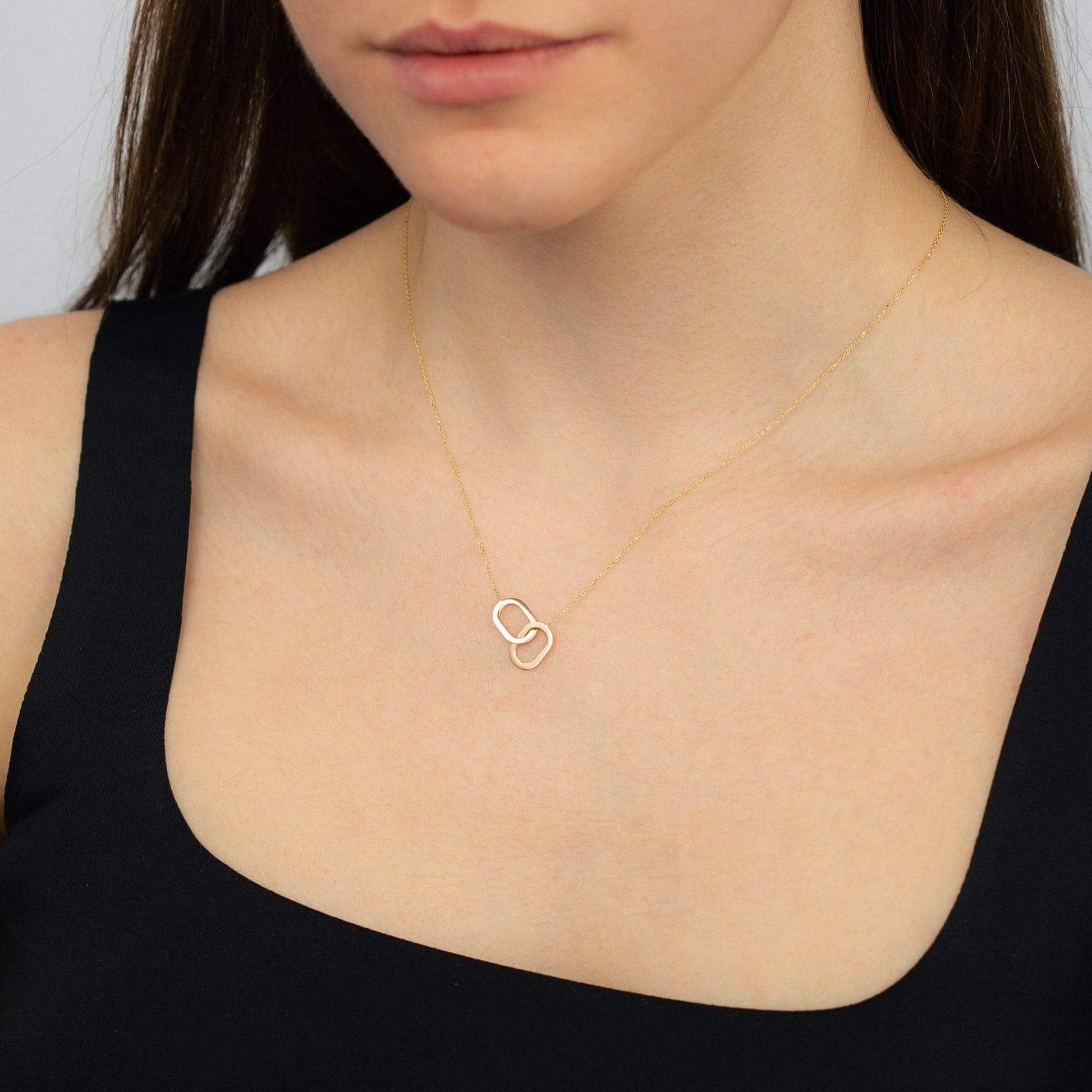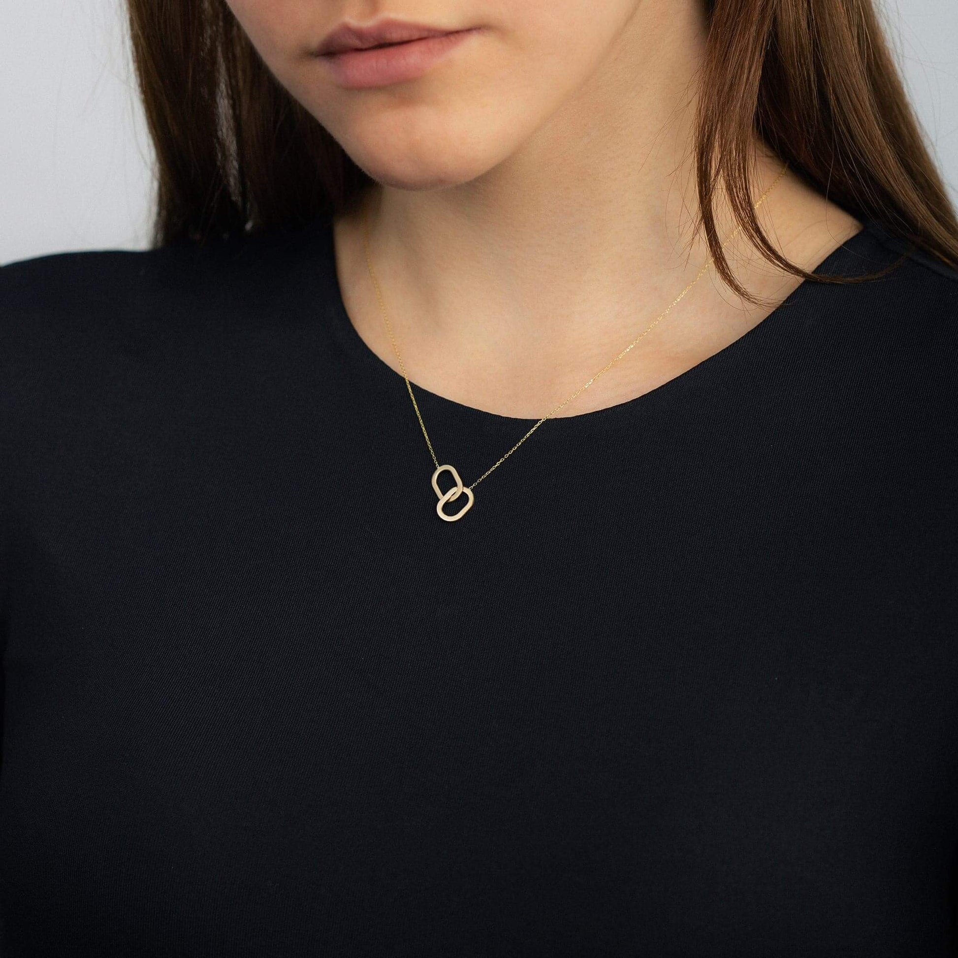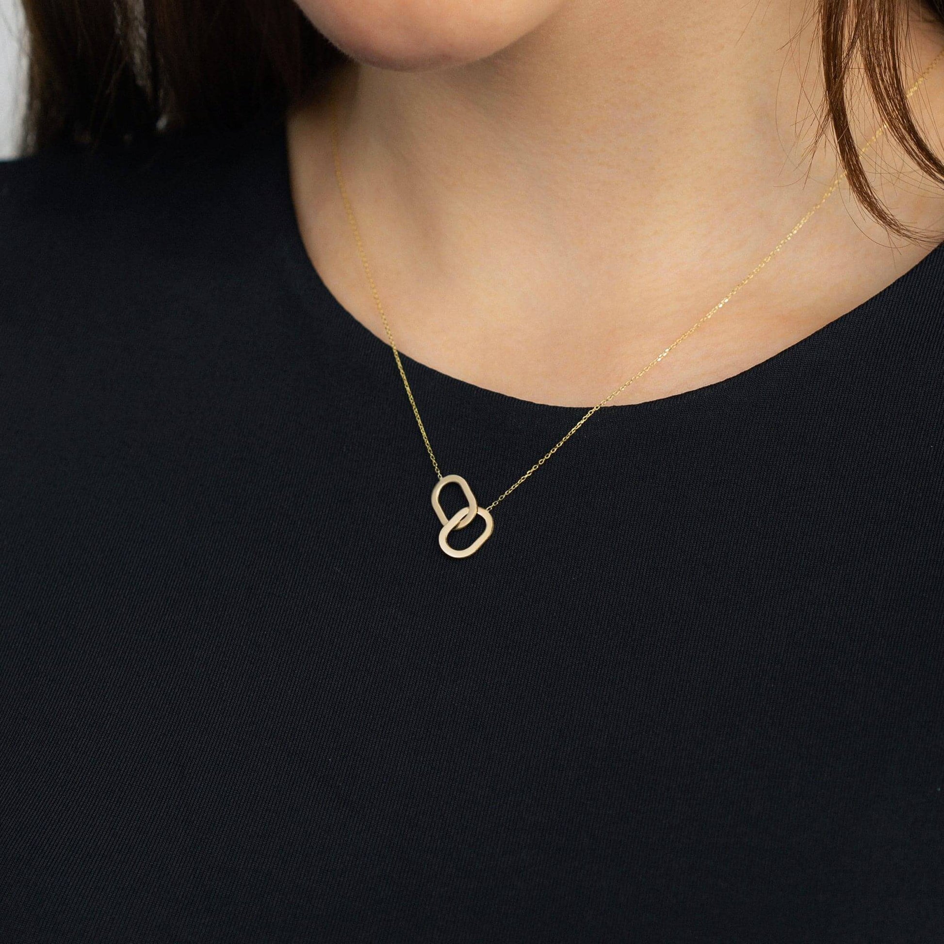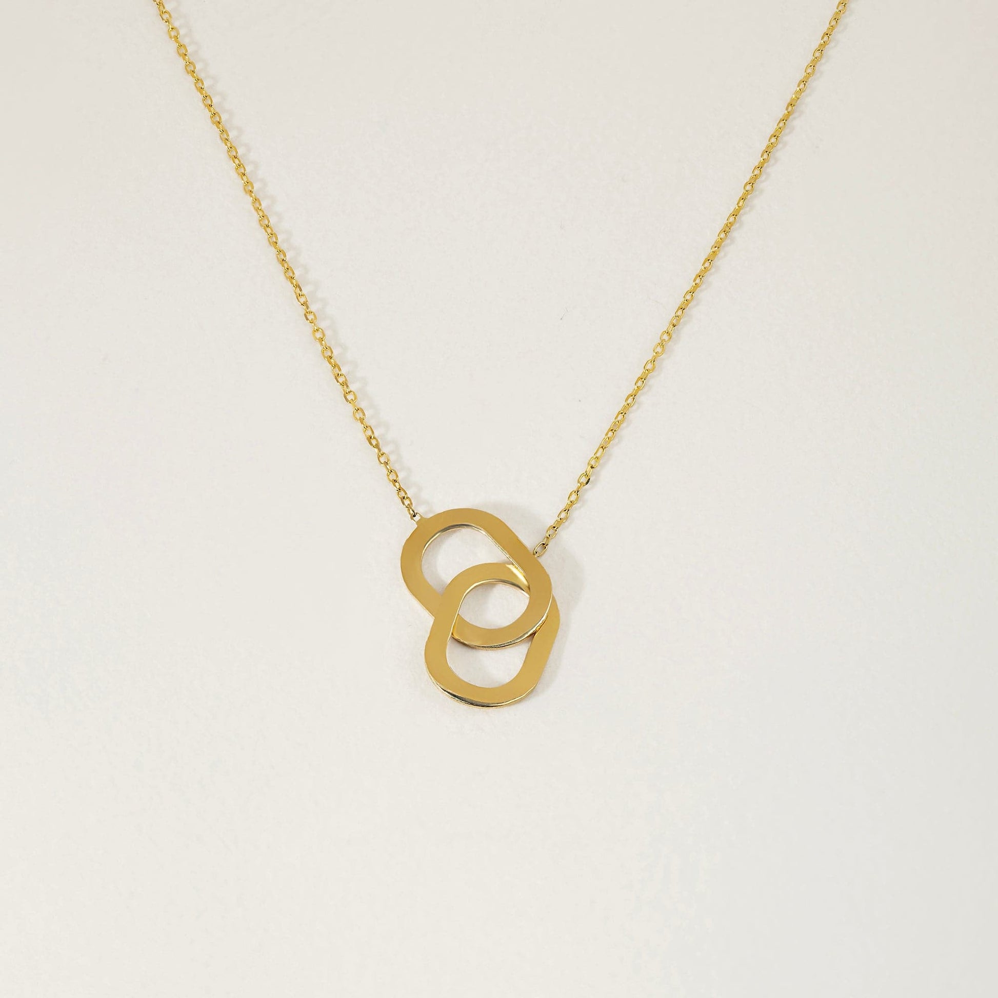 Bu iç içe geçmiş halka kolye ucuyla kıyafetinize zarafet katın. Sade tasarımı, onu her gün takabileceğiniz zamansız bir parça haline getiriyor. Herhangi bir kıyafetinize biraz ihtişam katmak veya hayatınızdaki özel birine hediye etmek için kullanabilirsiniz!